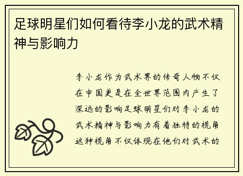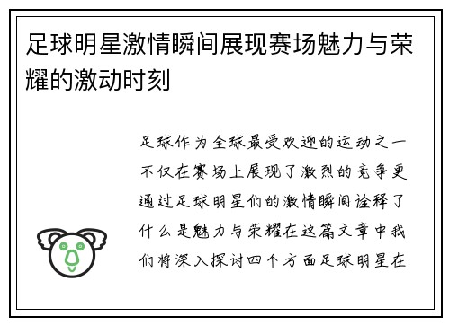 本文将探讨普通明星与足球明星之间的奇妙碰撞所展现出的光辉与梦想。我们首先分析了这两类明星在公众心目中的形象和影响力,接着讨论他们在不同领域中追求梦想的共同点,随后探究这种交集如何激发更多人对梦想的追求,最后总结这一切如何反映出当今社会对成功与个人价值的多元理解。在普通明星与足球明星的互动中,我们不仅看到了个体努力的成果,更感受到了他们为社会带来的积极影响,以及那些闪耀在光环背后的真实故事和情感。 ...