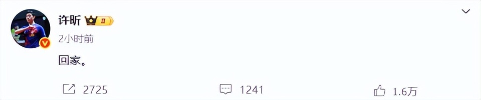 尽管上海队赢球,许昕在赛后还是表达了不满,他第一时间在社媒上发文,但是只写了两个字——回家。这两个字可以看作是乒超联赛结束要回家了,但更多的是想表达不满。